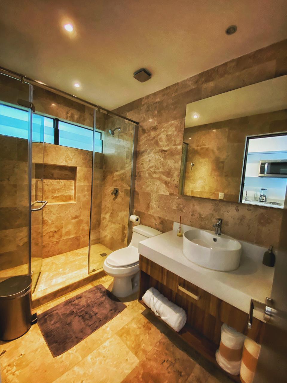 El edificio cuenta con elevador, rooftop con alberca, gimnasio , tumbonas alrededor de la alberca. La zona donde esta localizado el edificio tiene una excelente ubicación; llena de restaurantes, bares y a una cuadra de la 5ta Avenida.