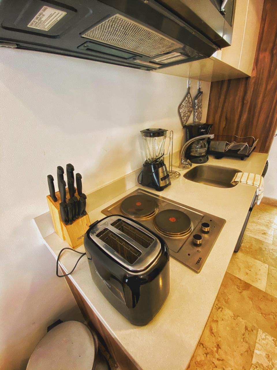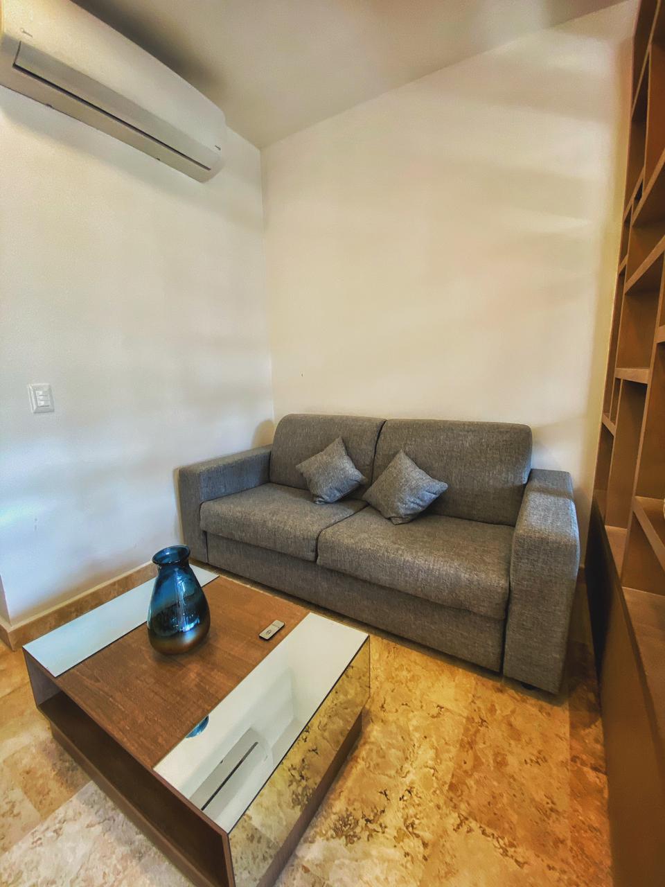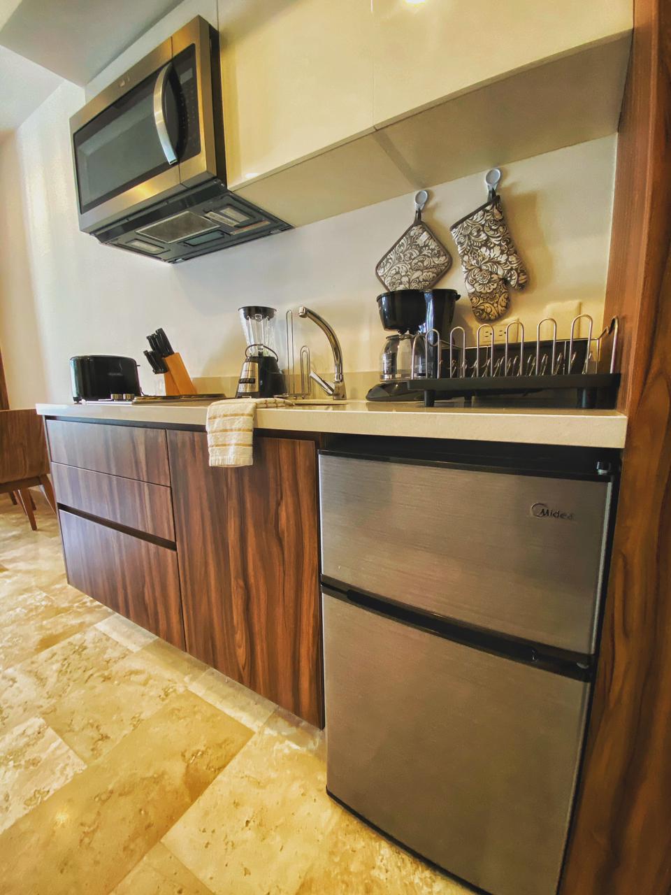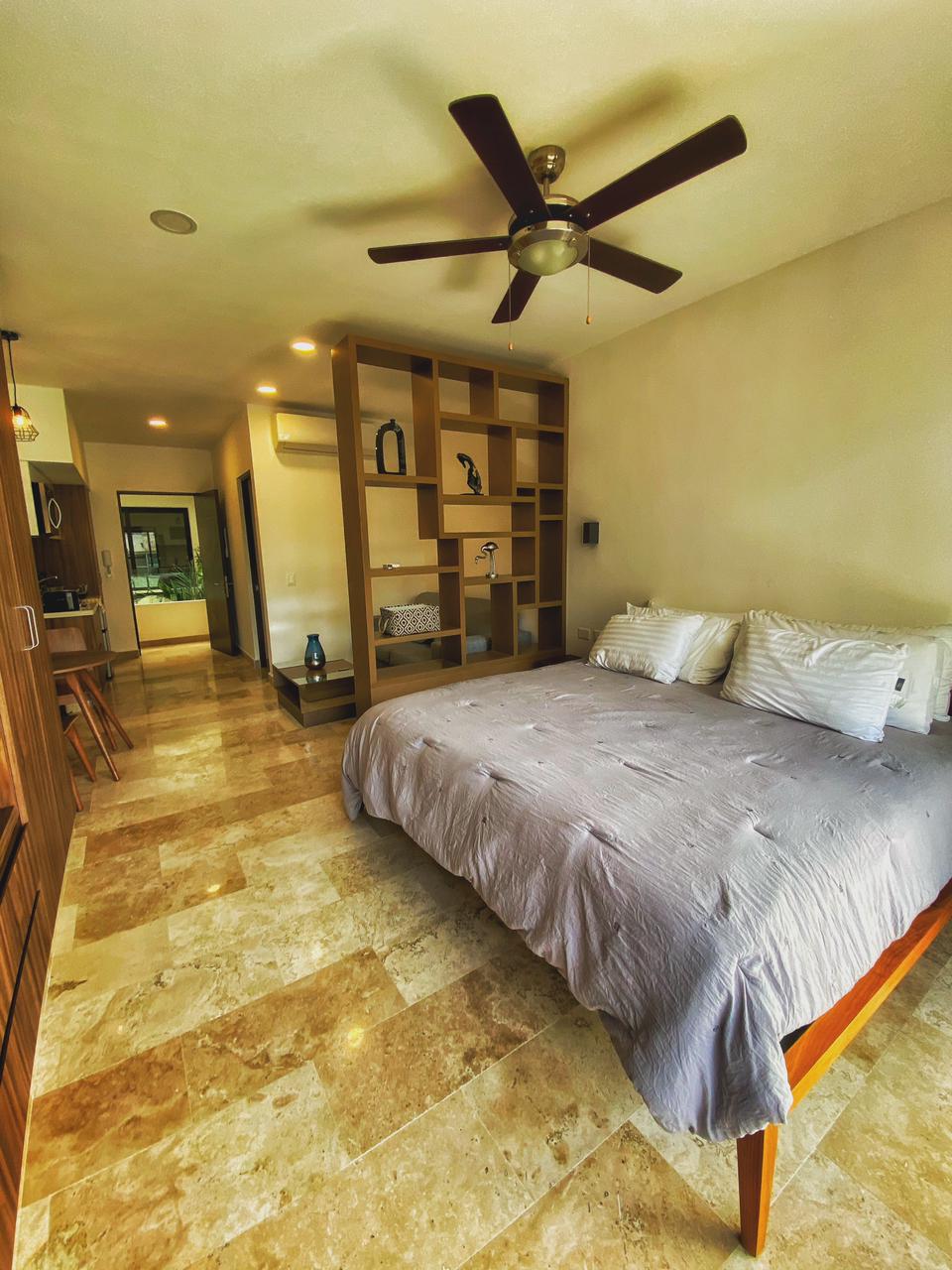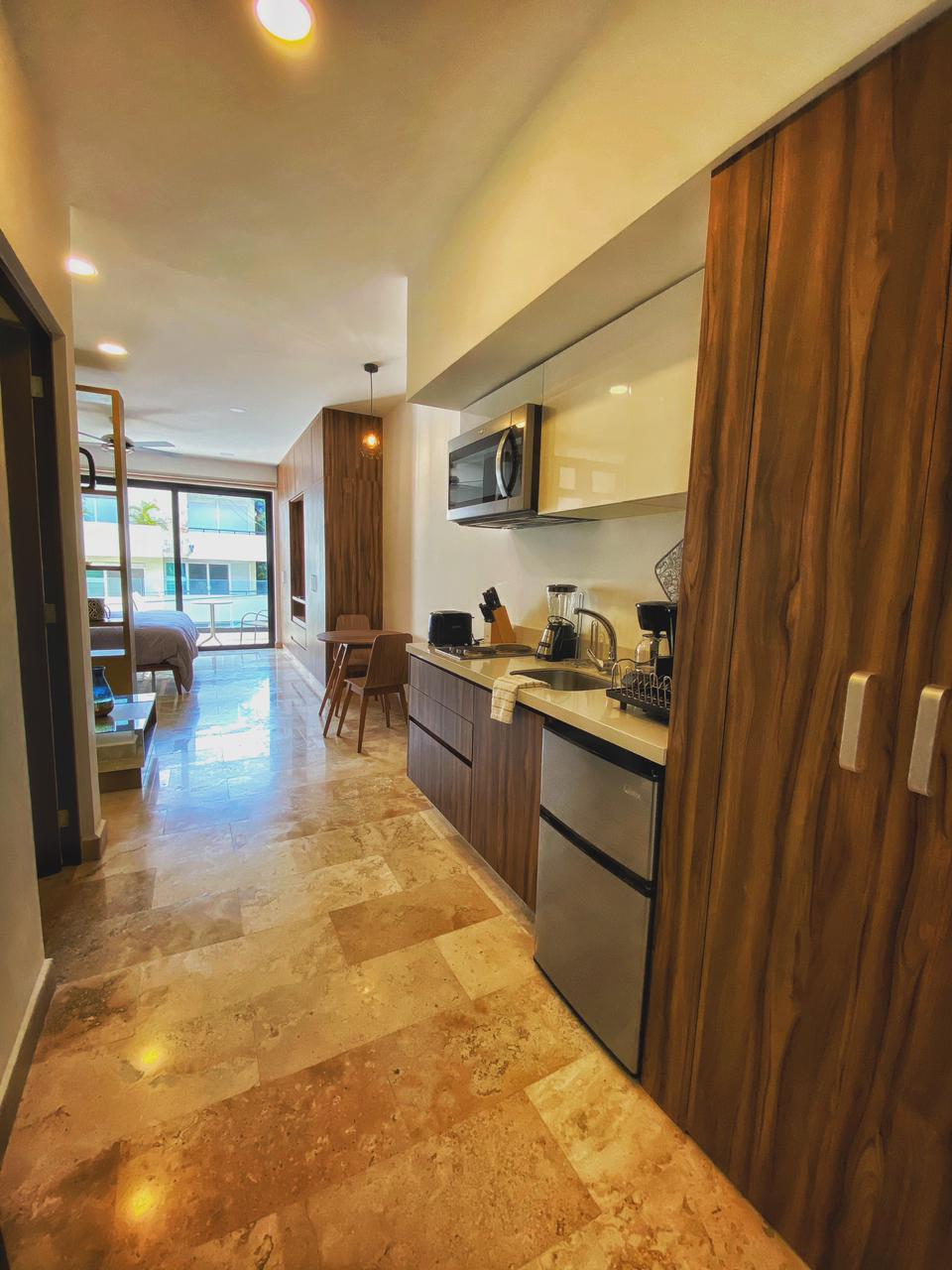 Este nuevo y hermoso Estudio de una recamara esta adecuadamente amueblado y decorado para pasar una estancia placentera en Playa del Carmen; cuenta con una cocina integrada dentro del espacio y un comedor para dos personas, acabados de primera en interiores y además cuenta con aire acondicionado, refrigerador de o pies y una cómoda cama King Size, Sofá cama y una terraza con un pequeño comedor para completamente nueva propiedad se encuentra en el lugar per personas. Ideal para hospedar hasta 3 personas.